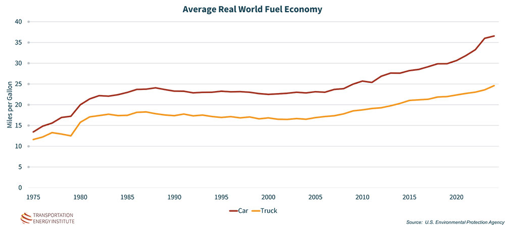 On a positive note, the fuel efficiency of the U.S. vehicle fleet continues to set records. In model year 2024, the average new vehicle achieved a record high of 27.2 MPG – 36.6 for cars and 24.6 for trucks. Despite consumer preference for heavier utility vehicles and trucks, technological advancements have continued to push efficiency upward.