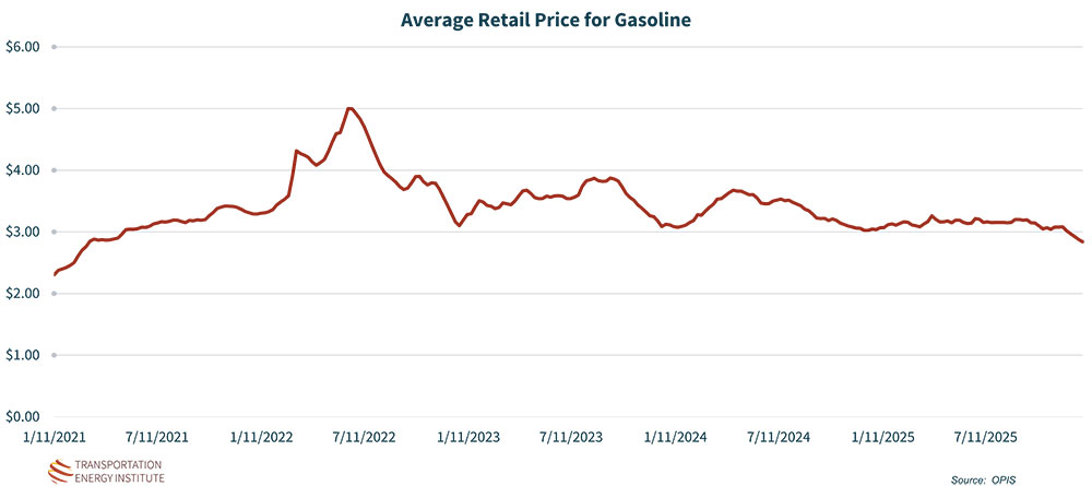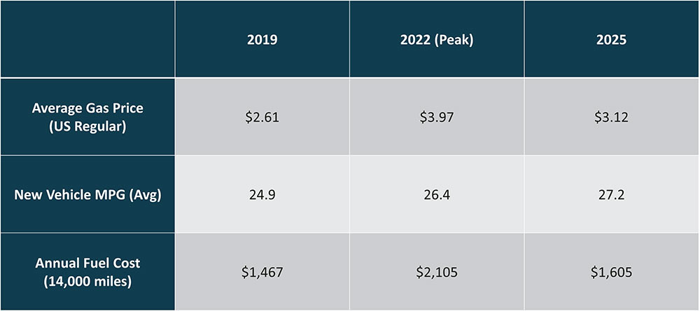 U.S. gasoline prices have been on a roller coaster, with the pandemic driving prices down and then geopolitical unrest driving them back up. Since 2021, prices averaged $3.40 on a weekly national basis, posting a low national average weekly price of $2.31 in January 2021 and a high of $5.00 in June 2022. The combined impact of fuel efficiency improvements and retail fuel prices have an effect on household finances. In 2019, consumers spent about $1,467 to drive 14,000. This increased to $2,105 in 2022 and dropped back down to $1,605 in 2025.
